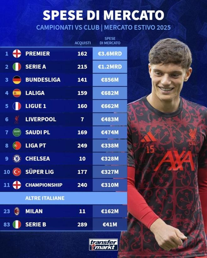 意甲走“量+控本”:引援数比英超多(215 vs 162),但总支出仅为三分之一,导致单签成本显著更低(558 万 vs 2222万欧)。这通常意味着更多免费/低价转会、租借+买断、以及瞄准中低价段与潜力股。