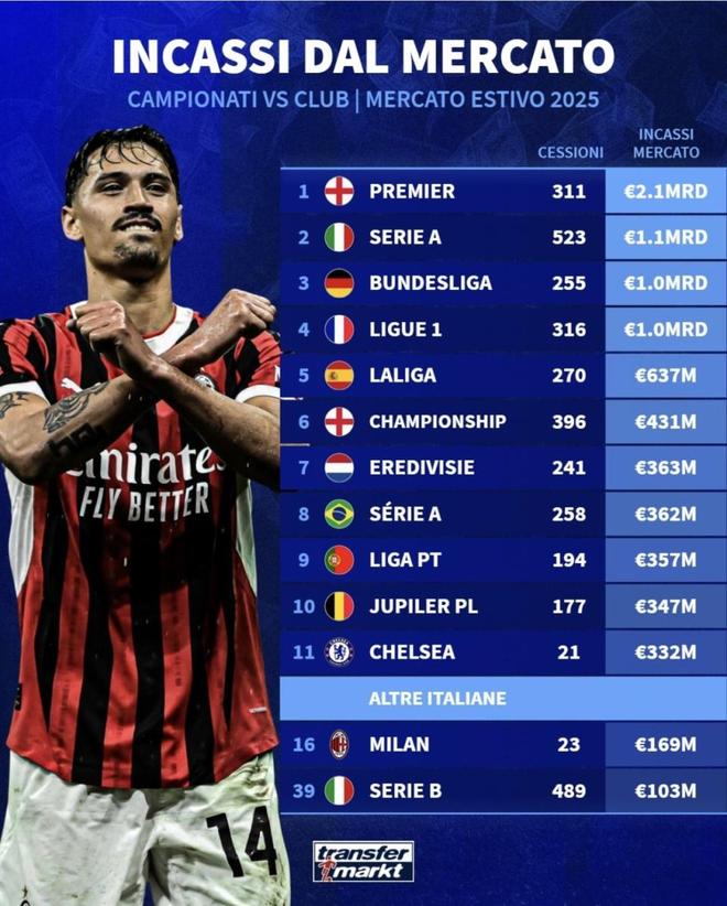 — 意大利其他:AC 米兰|出售 23|收入 1.69亿欧元